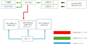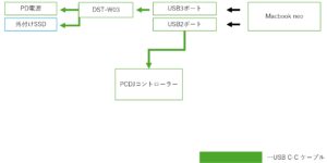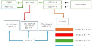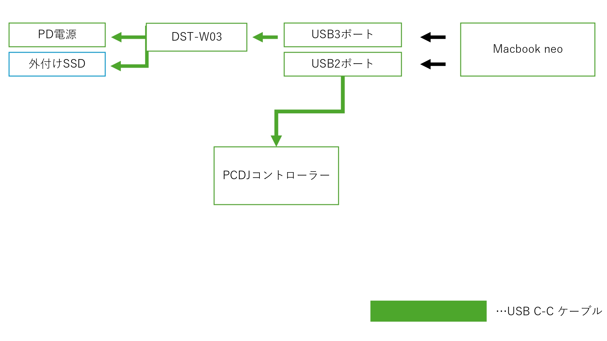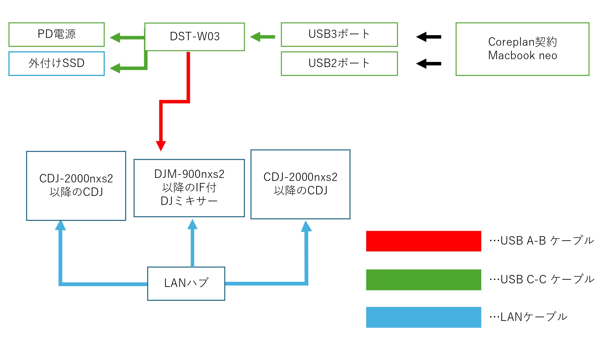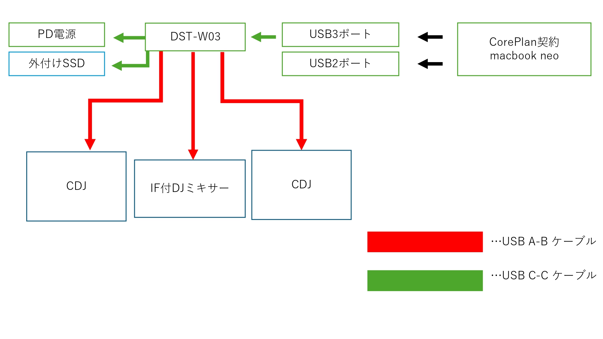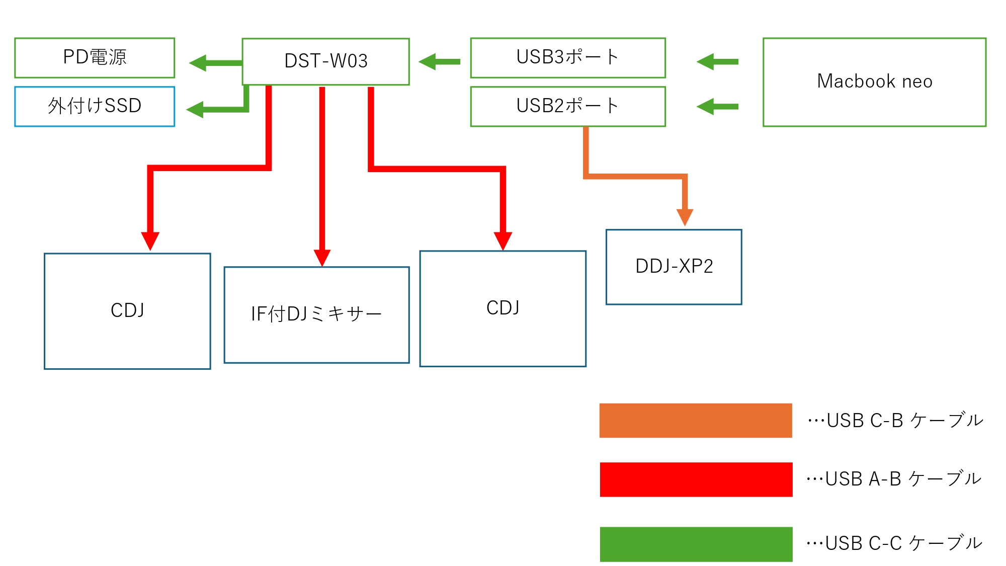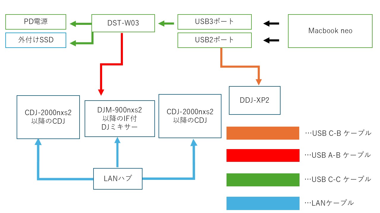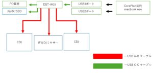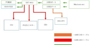 狙いとしてはSSDの速度は担保したい&電力負荷が低いHIDをまとめる意味でssd、cdj、djmのUSBケーブルはドッキングステーションに接続。