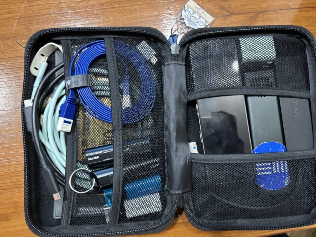 lanケーブル、USBメモリ×4、SSD、USBハブが入っており、このポーチとヘッドホンさえ持って行けばひとまず最低限DJはできるセットです。